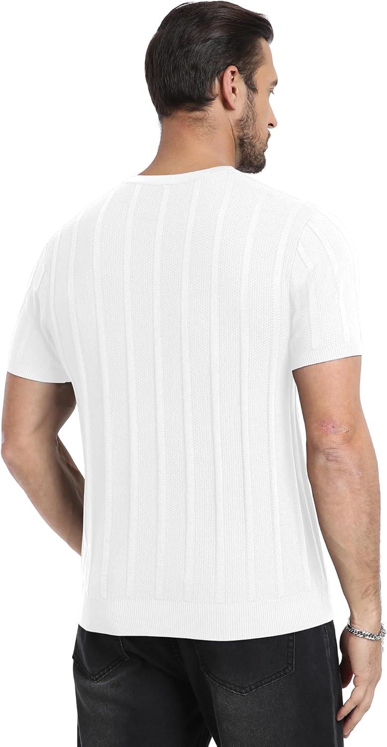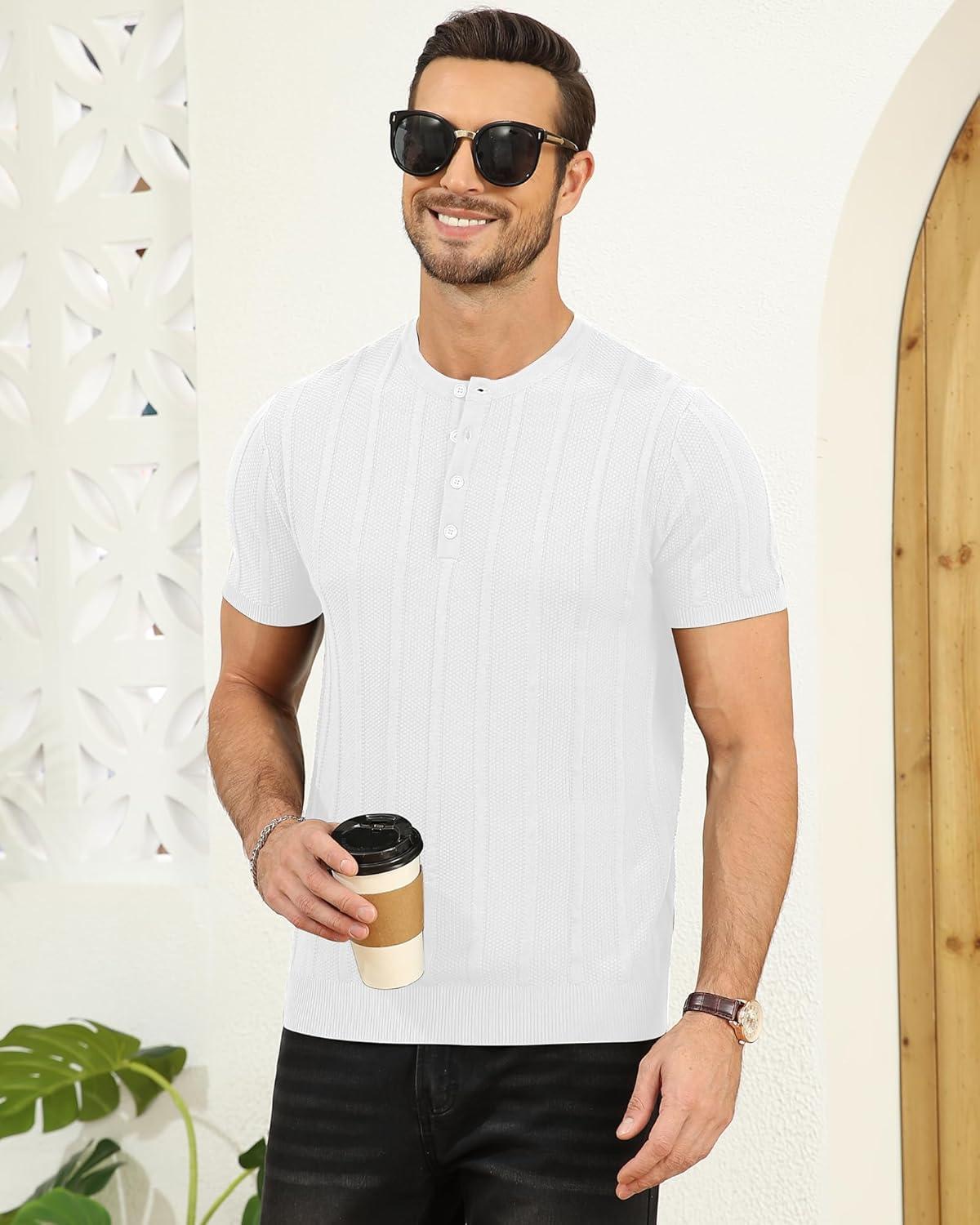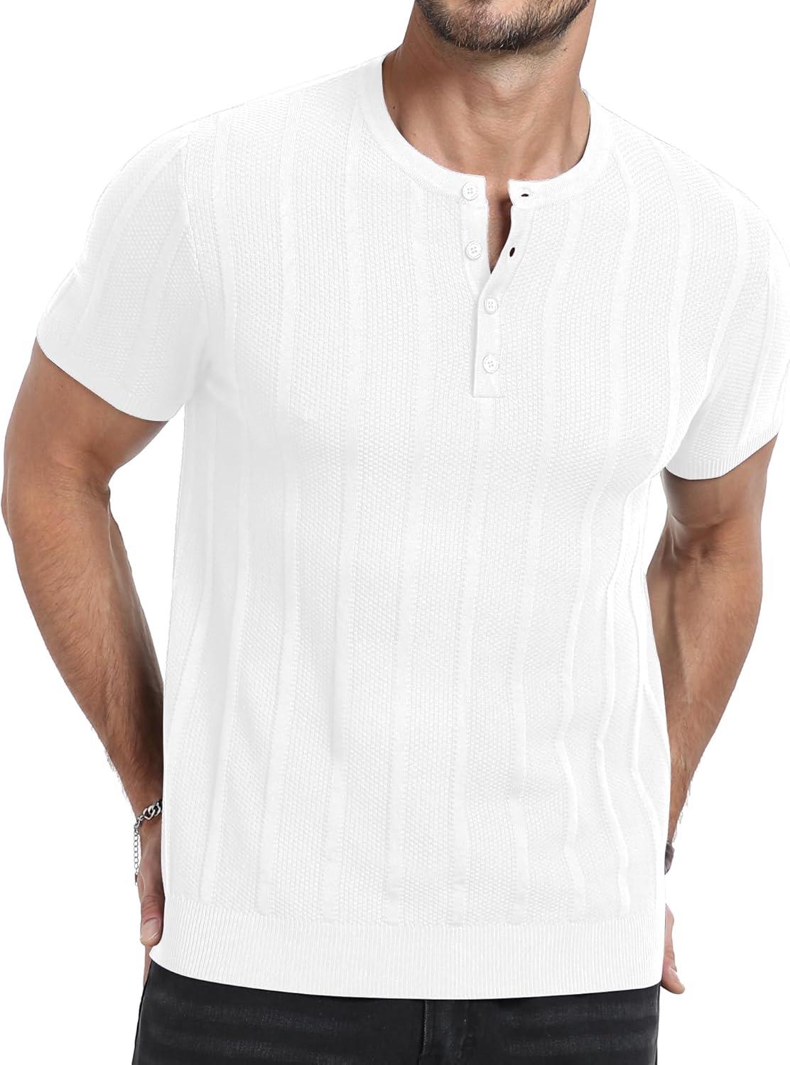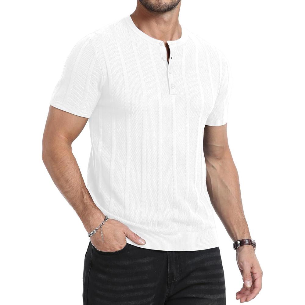 YTD Men’s Henley T-Shirts Short Sleeve Knit Sweater Shirt Casual Solid Ribbed Pullover Tee(White)