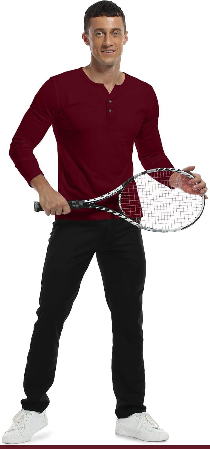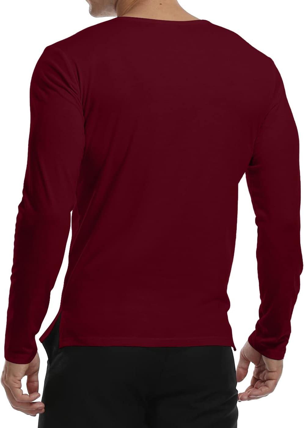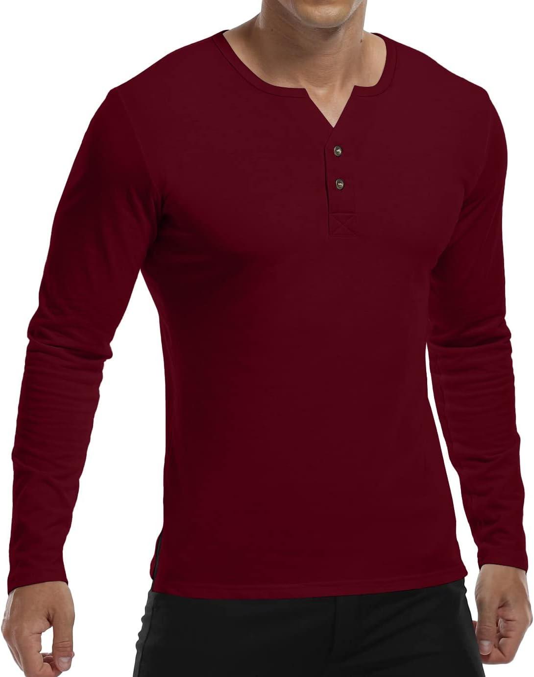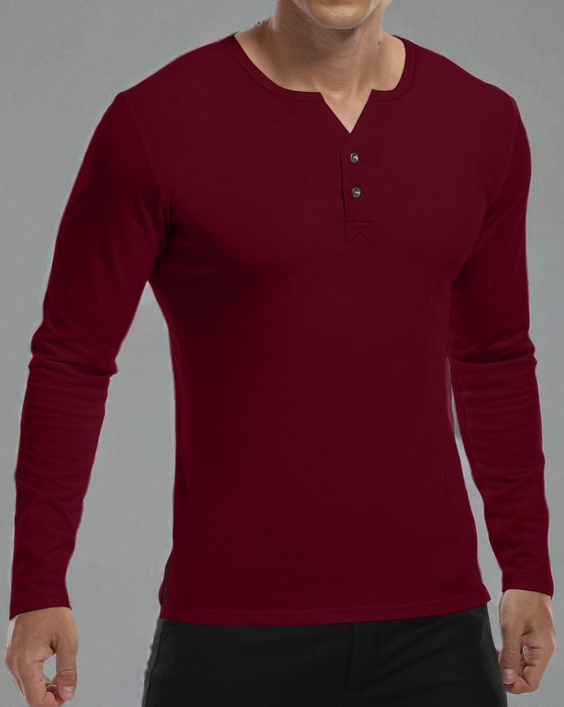YTD Mens Summer Casual Short Sleeve Henley T-Shirts Button Placket Plain V Neck Shirts(Long Sleeve Wine Red)